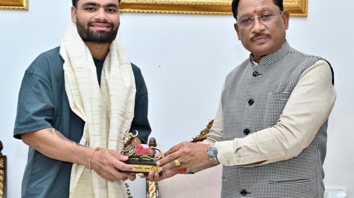 TFP Bureau, Raipur, November 23, 2025: Indian cricket team batsman and internationally acclaimed player Rinku Singh paid a courtesy visit to Chief Minister Vishnu Deo Sai at his residence office in Raipur on Sunday. The Chief Minister extended a warm welcome to the cricketer, presenting him with a traditional shawl and a Nandi memento. MLA Sushant Shukla was also present during the meeting.