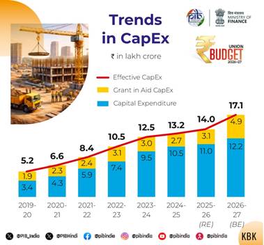 Recognising MSMEs as a vital growth engine, a ₹10,000 crore SME Growth Fund has been proposed to nurture future champions, while public capital expenditure has been enhanced from ₹11.2 lakh crore in BE 2025–26 to ₹12.2 lakh crore in FY 2026–27, continuing the investment-led growth momentum.